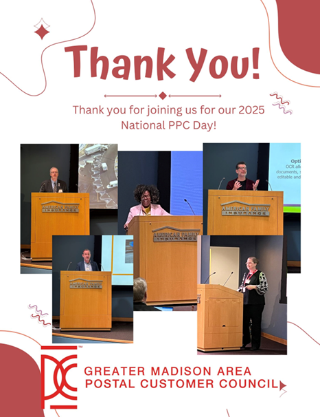 In preparation for the 2025 Greater Madison Area PCC Day, the Madison planning committee held several virtual meetings to identify a speaker who would complement the event’s agenda. A variety of options were considered—from motivational speakers to university mailroom professionals who could provide insight into large-scale mail operations. The turning point came when La Verne Morgan-Hill, Postal Co-Chair and Manager of Customer Relations for the Wisconsin District, engaged her Business Service Network Representatives for speaker suggestions, which significantly shaped the final lineup.